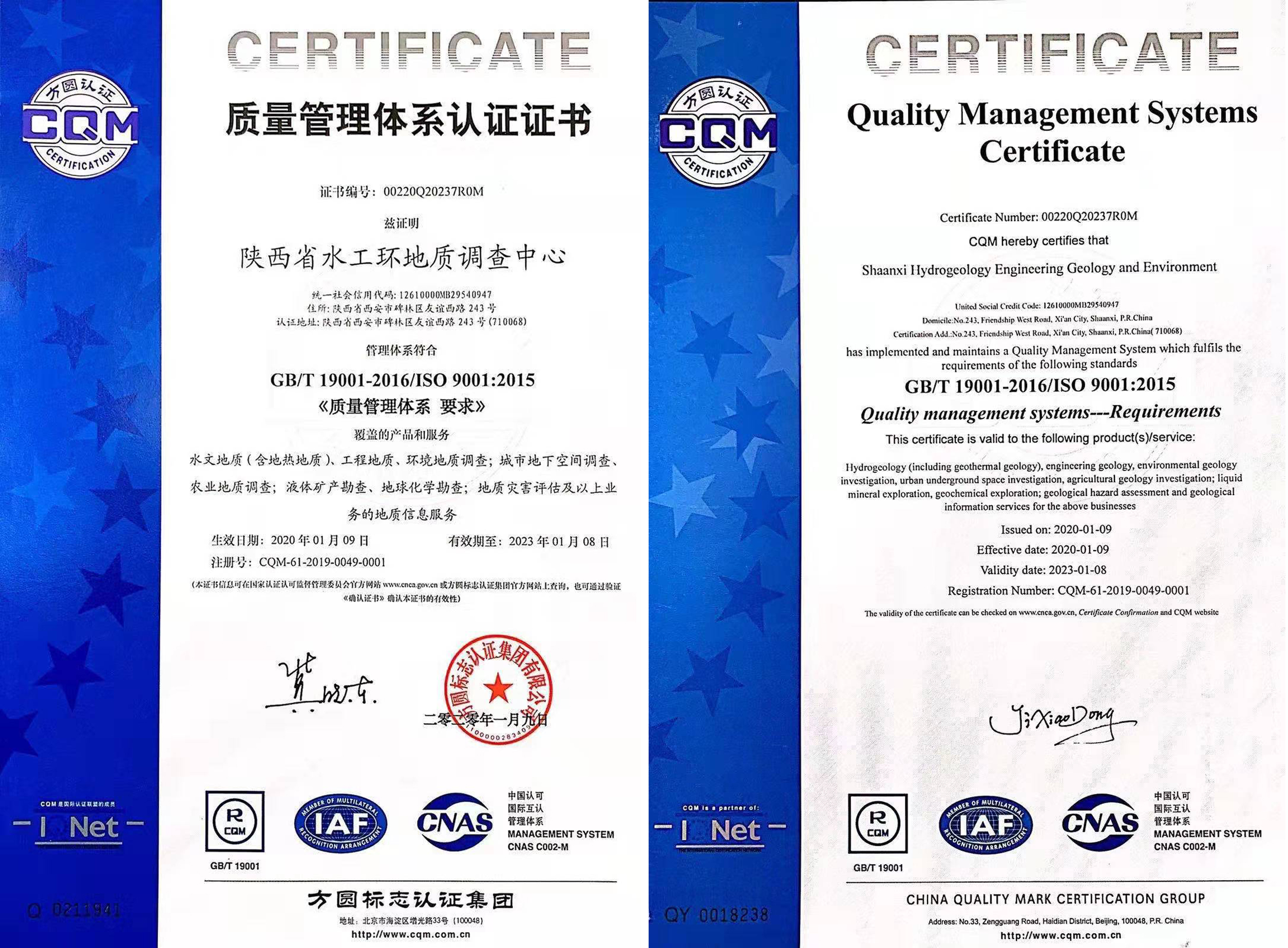 水工環(huán)中心自成立以來(lái),一直將質(zhì)量作為生存的命脈,于2019年4月出臺(tái)了陜西省水工環(huán)地質(zhì)調(diào)查中心《質(zhì)量手冊(cè)》《質(zhì)量記錄》《程序文件》(試運(yùn)行稿),同時(shí)向方圓標(biāo)志認(rèn)證公司提交認(rèn)證申請(qǐng)。方圓標(biāo)志認(rèn)證機(jī)構(gòu)分兩個(gè)階段對(duì)我中心質(zhì)量體系運(yùn)行情況進(jìn)行了外部審核。通過(guò)外部審核,認(rèn)為“我中心質(zhì)量管理體系符合GB/T19001-2016/ISO 9001:2015《質(zhì)量管理體系 要求》”,并于2020年1月9日向我中心頒發(fā)了質(zhì)量管理體系認(rèn)證證書(shū)。