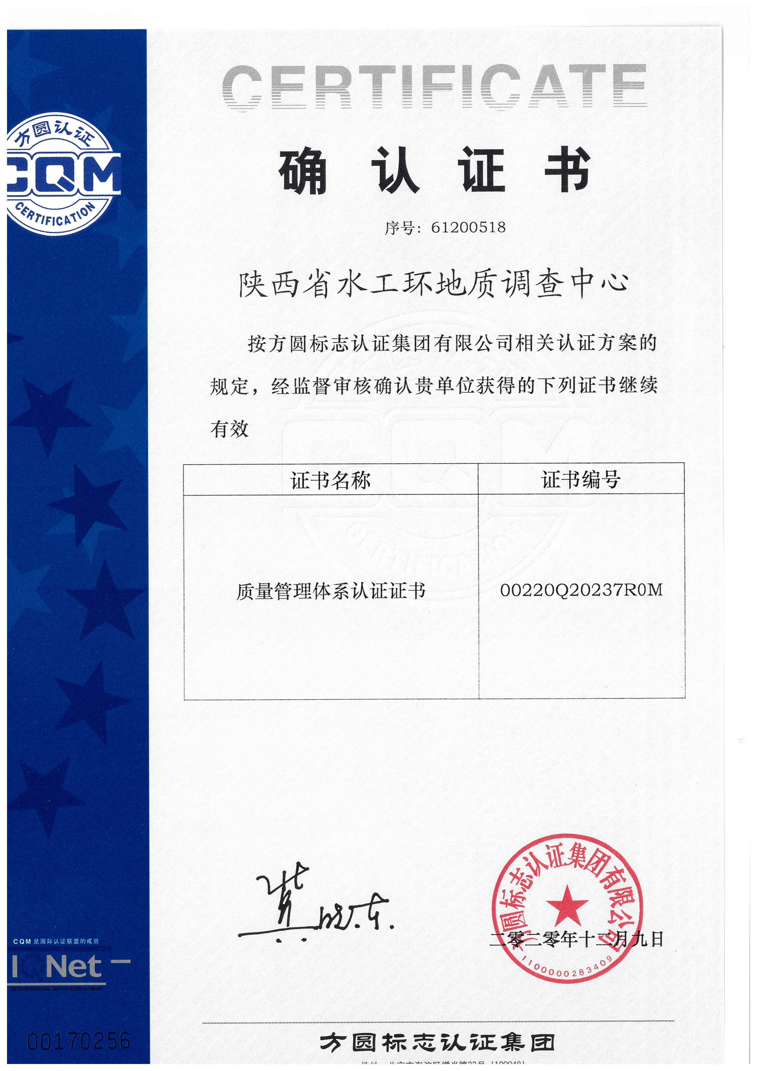 在中心領導高度重視及全體干部職工共同努力下,2020年11月26-27日方圓標志認證公司對我中心質量體系進行了年度監(jiān)督審核,于12月9日頒發(fā)確認證書。